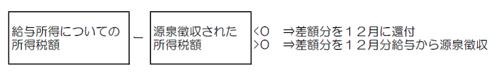 そして、この給与所得についての所得税額から1月から12月までの1年間に給与から源泉徴収された所得税の合計額を差し引いてマイナスになった場合にはマイナス分が還付され、プラスになった場合には会社が12月に支給する給与からプラス分を源泉徴収します。
