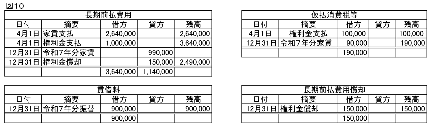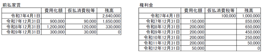下図は前払家賃と権利金の発生から消滅に至るまでの費用計上額、仮払消費税計上額、年末残高の一覧です。
