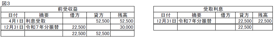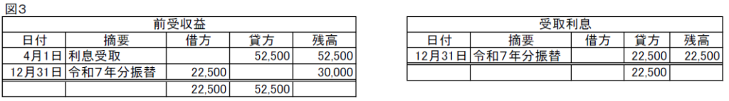 前受収益22,500/受取利息22,500   令和7年分の利息の収益化 ※1,000,000円×3%×9/12=22,500円