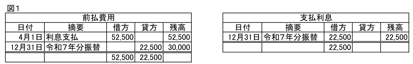 支払利息22,500/前払費用22,500  令和7年分の利息の費用化 ※1,000,000円×3%×9/12=22,500円