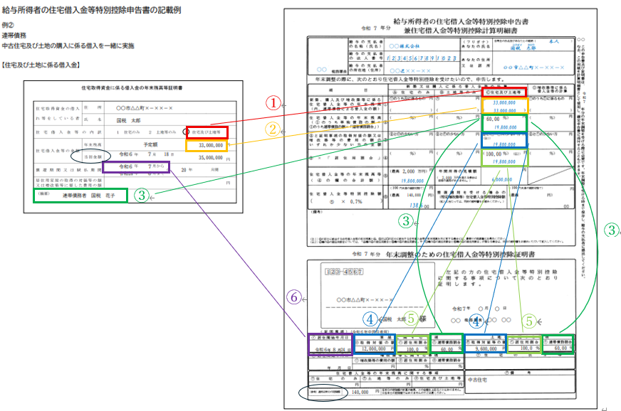ただし、リンクの記載例だけでは分かりづらい部分もあるので「②中古住宅及び土地の購入に係る借入を一緒に実施した場合(連帯債務あり)」をピックアップしてご説明します。