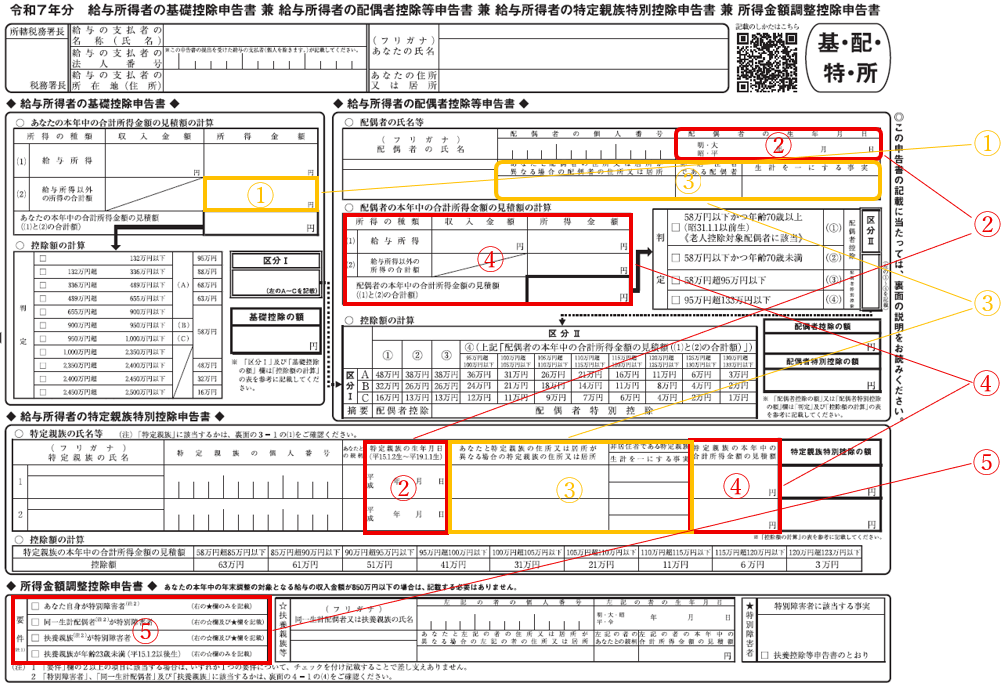 ②の源泉控除対象配偶者の所得の上限は95万円です。令和7年分の扶養控除申告書には控除対象配偶者を記載するのとは異なります。