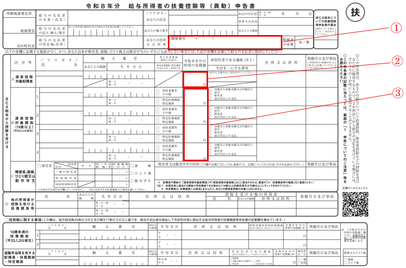 ③の源泉控除対象親族の所得の上限は基本58万円ですが、特定親族がいる場合には100万円です。特定親族の一部も記入する点が令和7年分の扶養控除申告書と異なります。