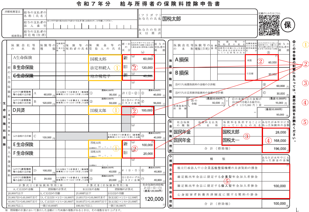 なお、上図においてC生命保険の保険金受取人である地方税花子は前年以前に離婚した元妻のため削除しています。仮に地方税花子とは令和7年7月に離婚した場合において、1月~12月分の保険料のうち離婚前に6か月分を支払っているときは削除せず、a)欄の40,000円を20,000円(40,000×6か月/12か月=20,000円)に訂正します。