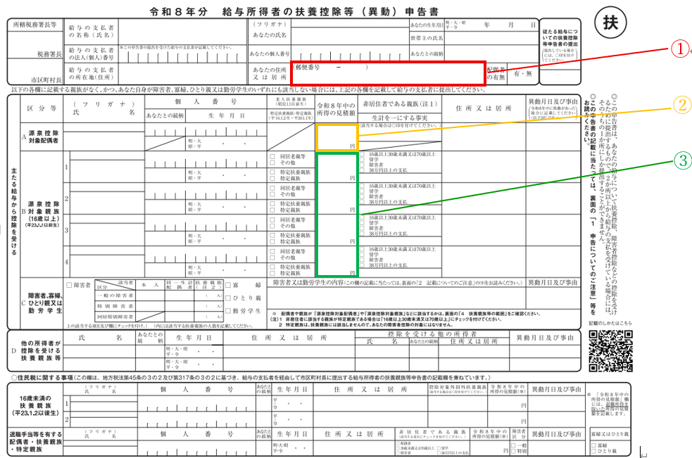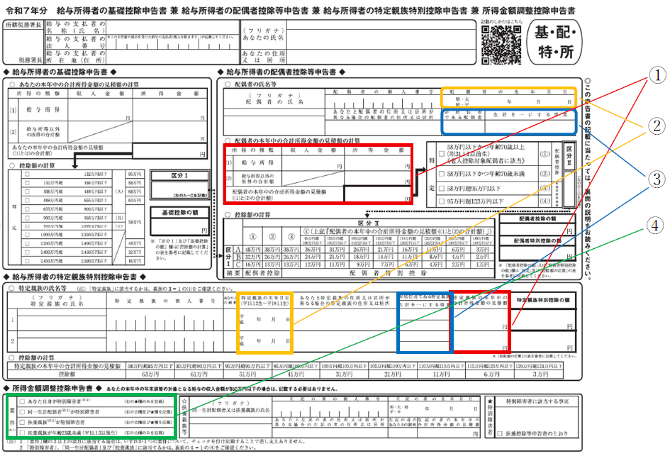 ③緑枠の所得の上限は基本58万円ですが、特定親族がいるについては100万円です。特定親族の一部も記入する点が令和7年分の扶養控除申告書と異なります。
