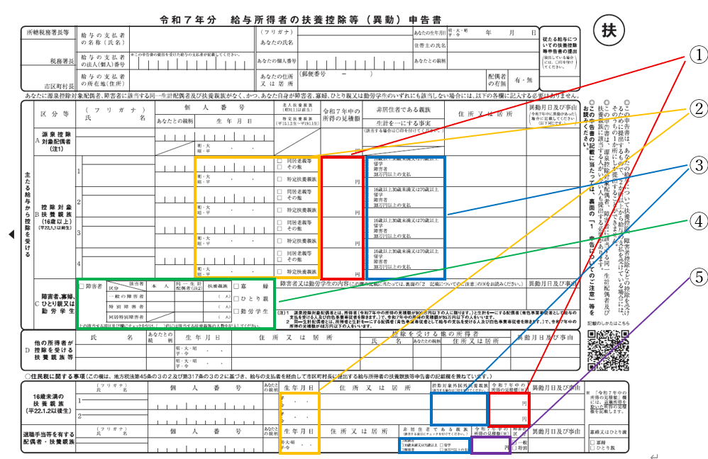 こちらは令和7年分の扶養控除申告書と記入方法は基本的に同じなので、一部注意を要する箇所のみご説明します。