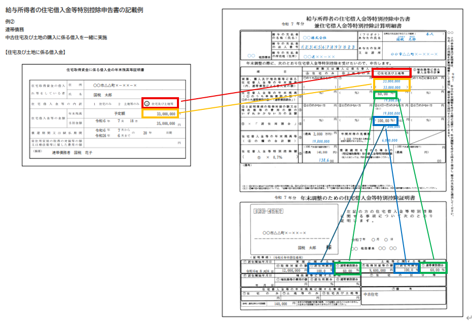 ただし、リンクの記載例だけでは分かりづらい部分もあるので「②中古住宅及び土地の購入に係る借入を一緒に実施した場合(連帯債務あり)」をピックアップしてご説明します。